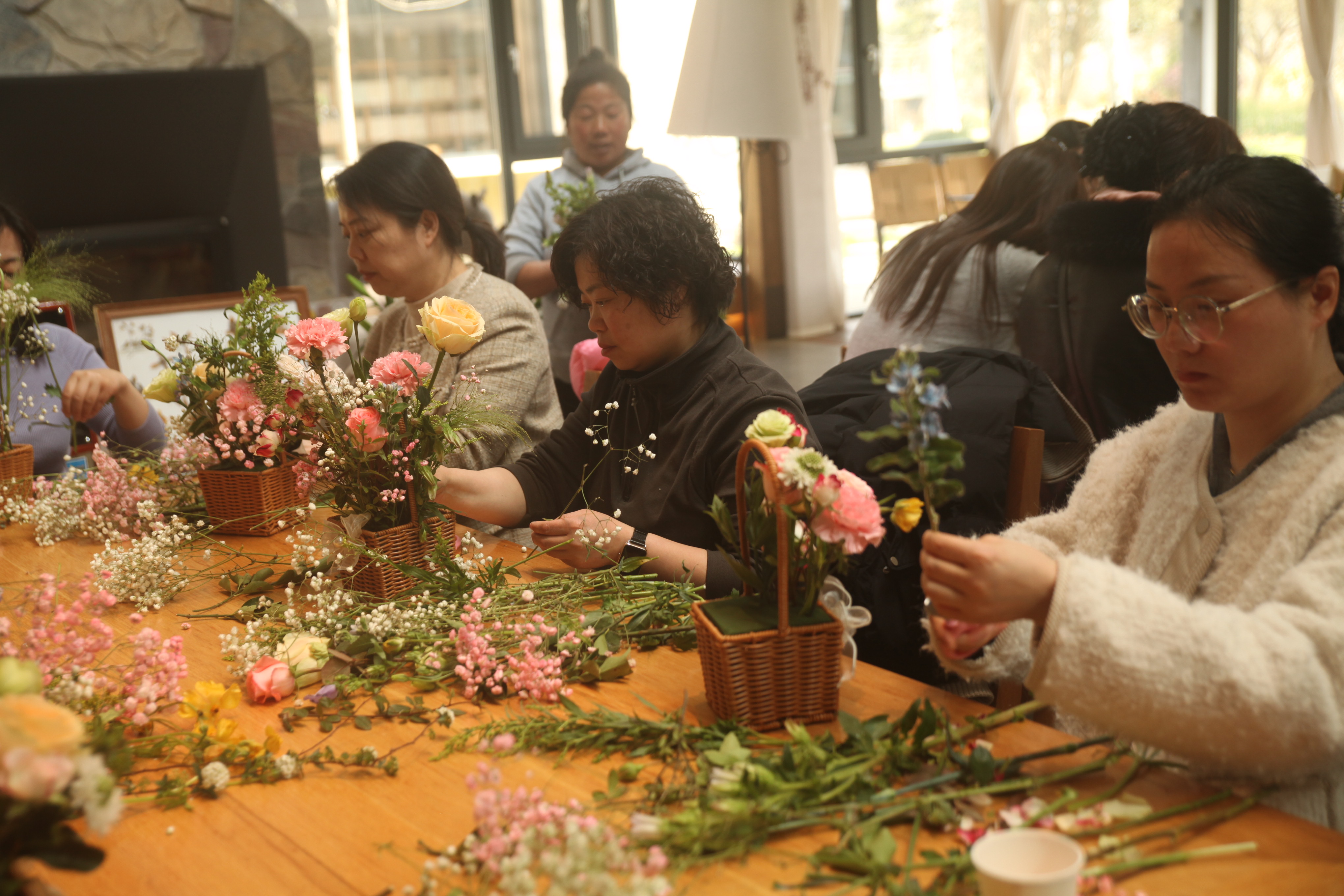 活動現場花香四溢,大家置身于花海之中。插花師現場講授選花、剪枝、搭配技巧,大家邊學邊練,有的注重色彩搭配,有的注重形態構圖,有的注重意境營造,經過大家的精心制作,一個個花籃逐漸成形,看著自己的作品,大家充滿了成就感和喜悅感。